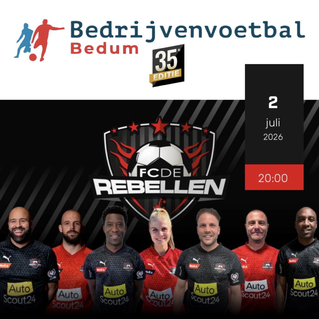 Wie speelt in ons team Bedrijvenvoetbal tegen FC de Rebellen op 2 Juli 2026?